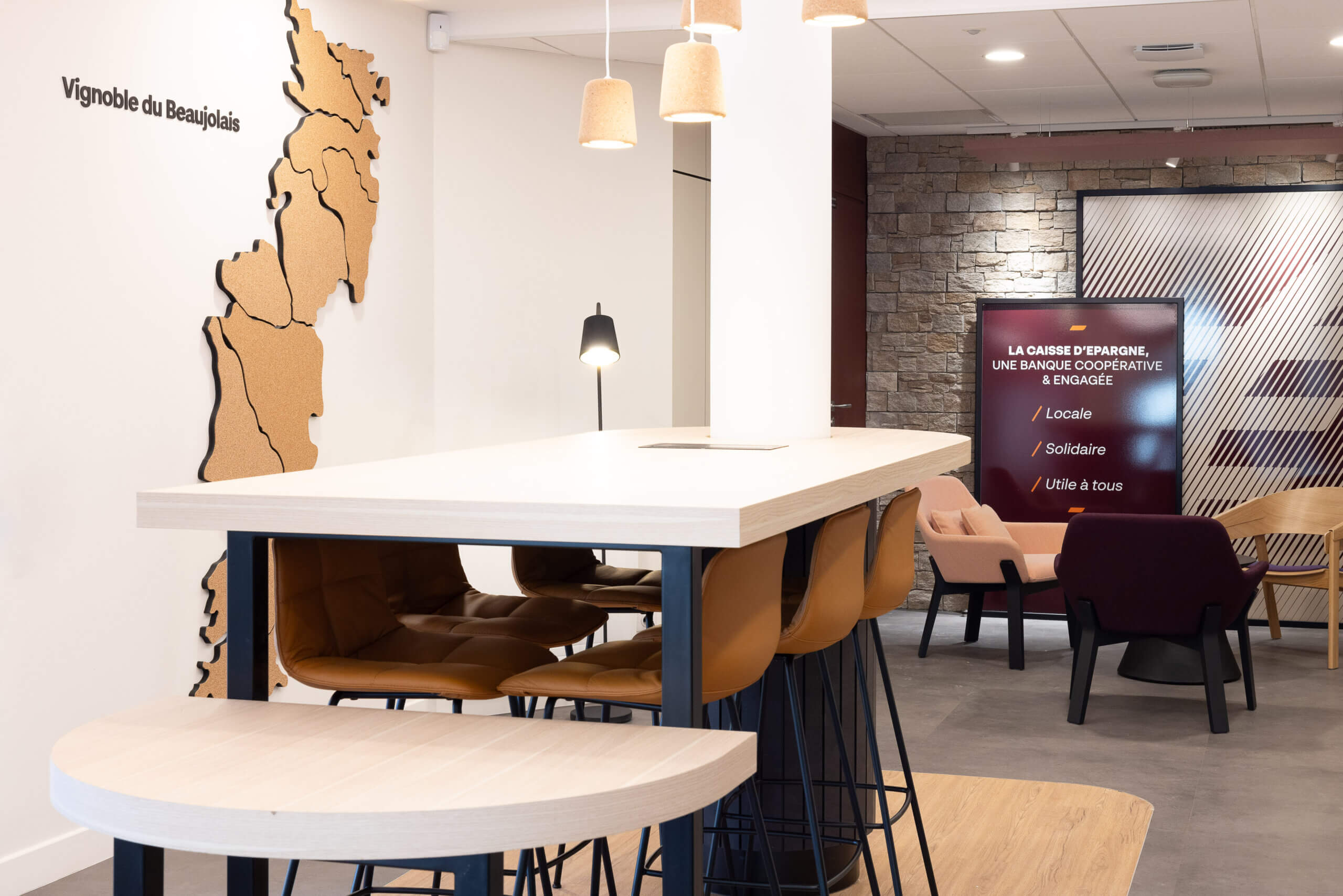 Espace4 a imaginé le nouveau concept de la Caisse d’Epargne Rhône Alpes. Pour cette agence existante implantée au cœur des vignobles du beaujolais, nous avons adapté ce nouveau concept, aux particularités de son territoire et au profil de ses clients viticulteurs.