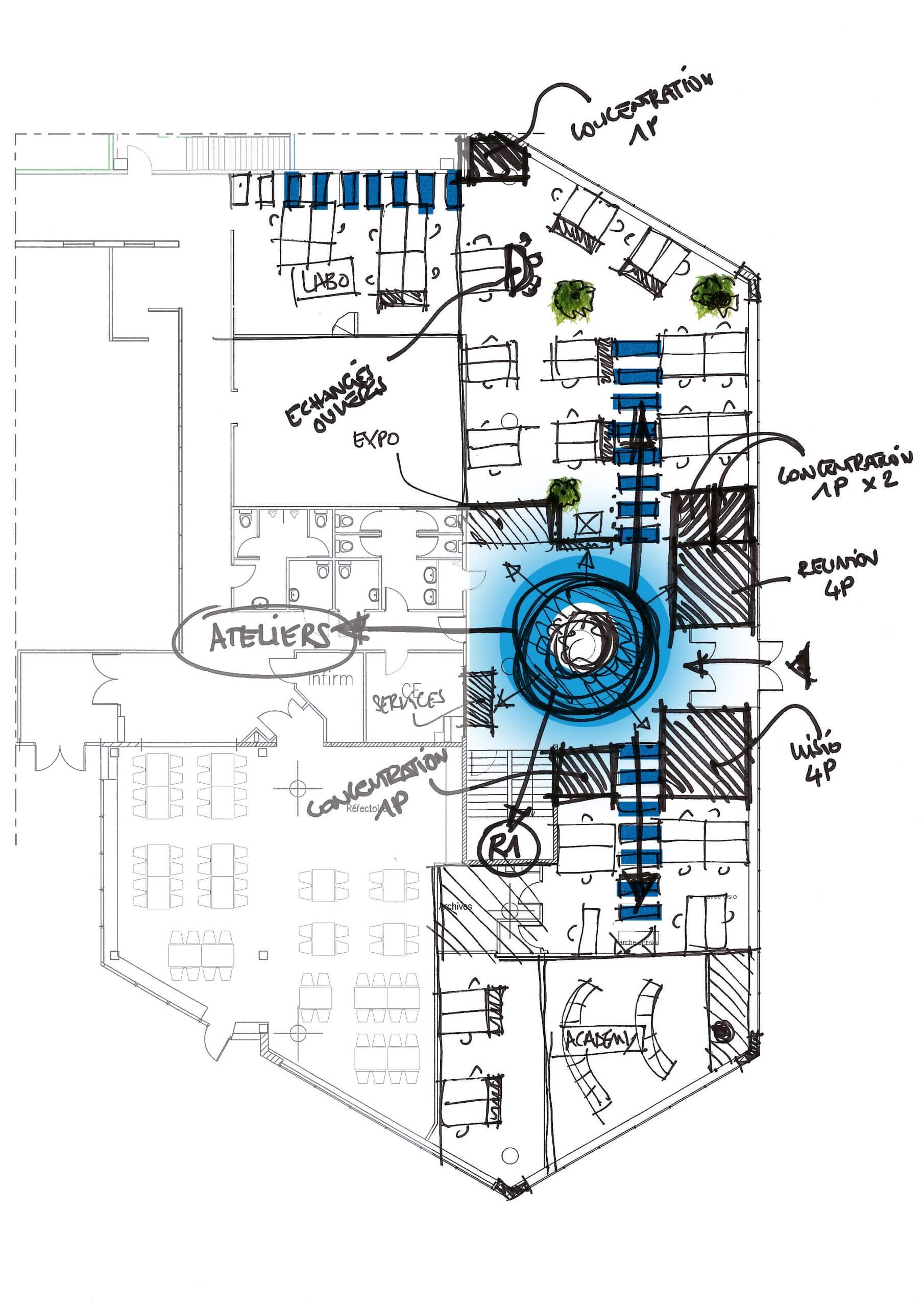 Dans un premier temps, nous avons co-construit le concept d’aménagement en concertation régulière avec l’ensemble des managers et des collaborateurs. Pour développer un concept d’aménagement responsable, il était important pour nous de comprendre qu’elles étaient les points de douleurs des usagers et pouvoir anticiper les besoins de demain.