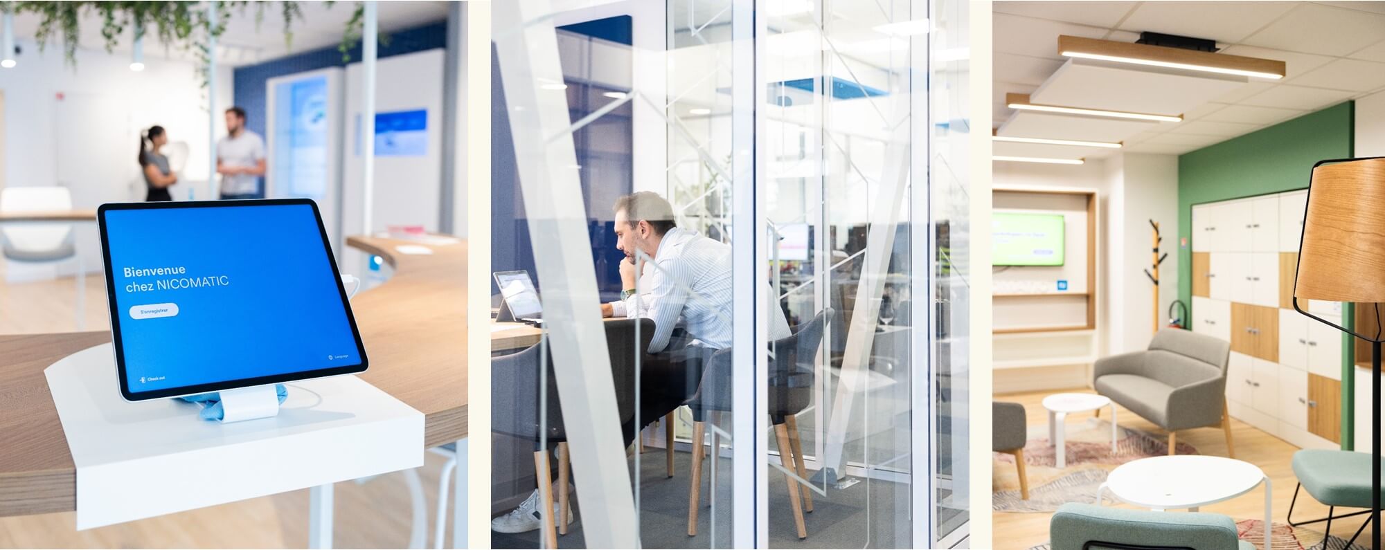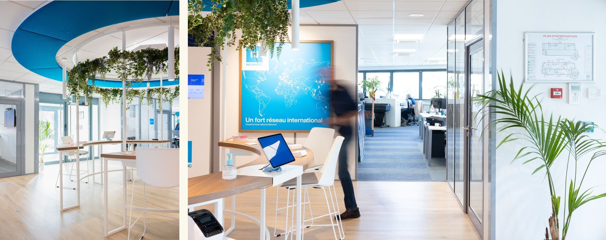 Au niveau visuel et esthétique, nos équipes ont imaginé une intégration stratégique des éléments graphiques et signalétiques de l’entreprise. L’espace d’accueil représente le principal changement d’image au sein de ce projet d’aménagement. Le design du lieu à la fois coloré, épuré et végétalisé a été pensé pour immerger totalement les individus au cœur des valeurs portées par Nicomatic.