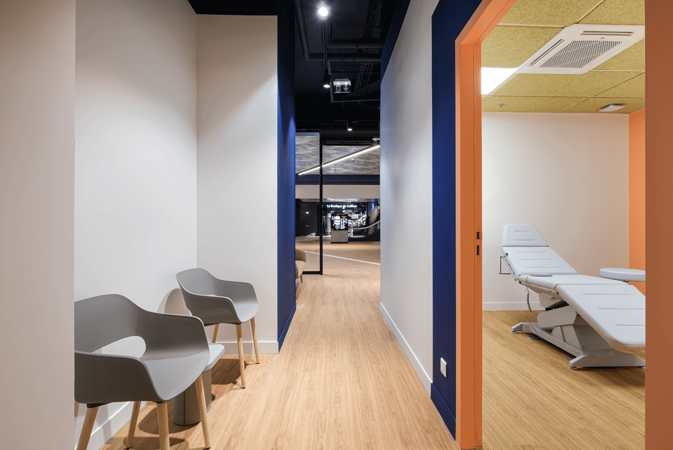 S’implanter dans un lieu atypique De surcroît, installer un centre dermatologique dans un centre commercial nécessite de s’adapter à un cadre réglementaire rigoureux. Bien que le site n’exige pas d’équipements médicaux spécifiques, il devait être conçu pour être accueillant et fonctionnel pour les consultations dermatologiques, tout en se conformant au règlement imposé par le CNIT. Par exemple, pour pallier l’absence de signalétique extérieure, nos designers ont conçu un élément iconographique mural pour capter le regard et incarner la marque.