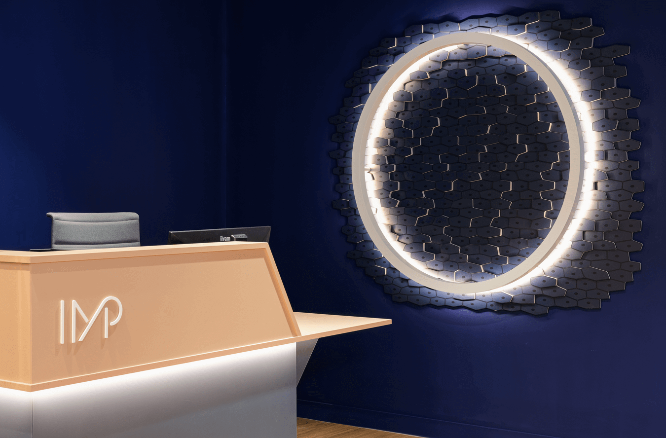 Créer et traduire une identité de marque Dans le cadre d’une implantation en centre commercial, être visible est un prérequis fondamental. Notre équipe de designers s’est imprégnée des marqueurs de l’ADN de l’IMP pour produire le dossier créatif et réaliser un lieu empreint de son identité de marque. Un design sur mesure qui pourra être décliné sur de futurs projets, ou appliqué à d’autres sites existants.